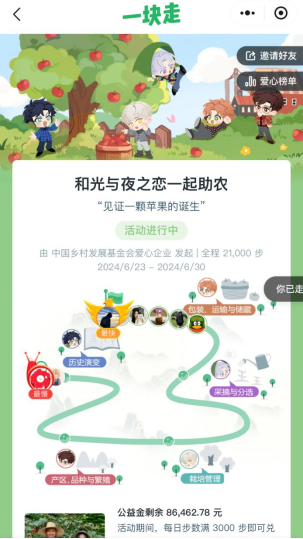 6月23日到6月29日期间,参与活动的游戏玩家只需每日微信步数满3000步,即可进行步数捐赠,获得由中国乡村发展基金会特别提供的助农公益金、腾讯公益小红花,累计步数还可解锁苹果相关的农业知识。微博发布后,立刻引发大批《光与夜之恋》玩家转发、点赞、评论,并纷纷表达了对于参与此次公益活动的浓厚兴趣。6月23日,“一块走”互动小程序上线,也宣告此次由中国农业展览协会支持,《光与夜之恋》和腾讯公益共同举办的助农公益活动正式开启。通过小程序当中的互动内容,玩家可以自游戏中的光启城出发,先后抵达多个里程碑节点,并依次解锁苹果种植相关的一系列专业知识。正如活动主题“见证一颗苹果的诞生”所描述的,随着小程序互动内容的逐步解锁,玩家得以从苹果的历史演变,产区品种介绍及繁育常识,到现代化栽培管理,采摘与分选,再到包装、运输与储藏“产业链”科普,通过见证一颗苹果从种子变成果实,并最终到达消费者手中的全过程,了解苹果产业方方面面的知识。