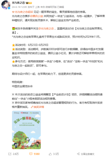 6月中下旬,中国农业展览协会支持腾讯游戏旗下知名数字IP《光与夜之恋》与腾讯公益携手,共同发起“一块走——和光与夜之恋一起助农,见证一颗苹果的诞生”公益活动,一方面普及苹果种植知识,一方面带动年轻人以“捐赠步数”的方式参与产业助农,并了解自“乡村振兴”战略实施以来,切实发生在田间地头的种种变化。作为数字IP产品,《光与夜之恋》在此次公益活动中充分利用了数字化优势,以数字媒介平台和数字化技术,让相关信息获得更广泛的传播,也带动了更多年轻人参与和了解。6月18日,《光与夜之恋》首先通过官方微博发布预告,宣布与腾讯公益合作开展以“和光与夜之恋一起助农,见证一颗苹果的诞生”为主题的公益活动,并宣布了活动实际执行时间与相关规则、参与方式。